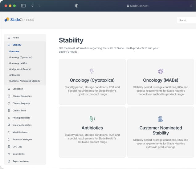 SladeConnect provides Slade Health hospital and pharmacy partners with secure digital access to a comprehensive collection of product resources, education, news and updates, forms and contact details for Key Account Managers.
